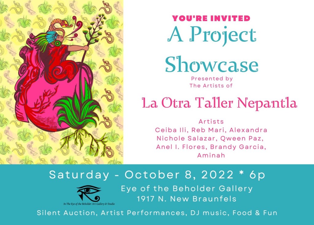 Join us as we celebrate the Fellows from the 2021-2022 La Otra Taller Nepantla Creative Residency as they exhibit art, performances, and an exclusive Zine release at Eye of the Beholder Art Gallery October 8th from 6-9.